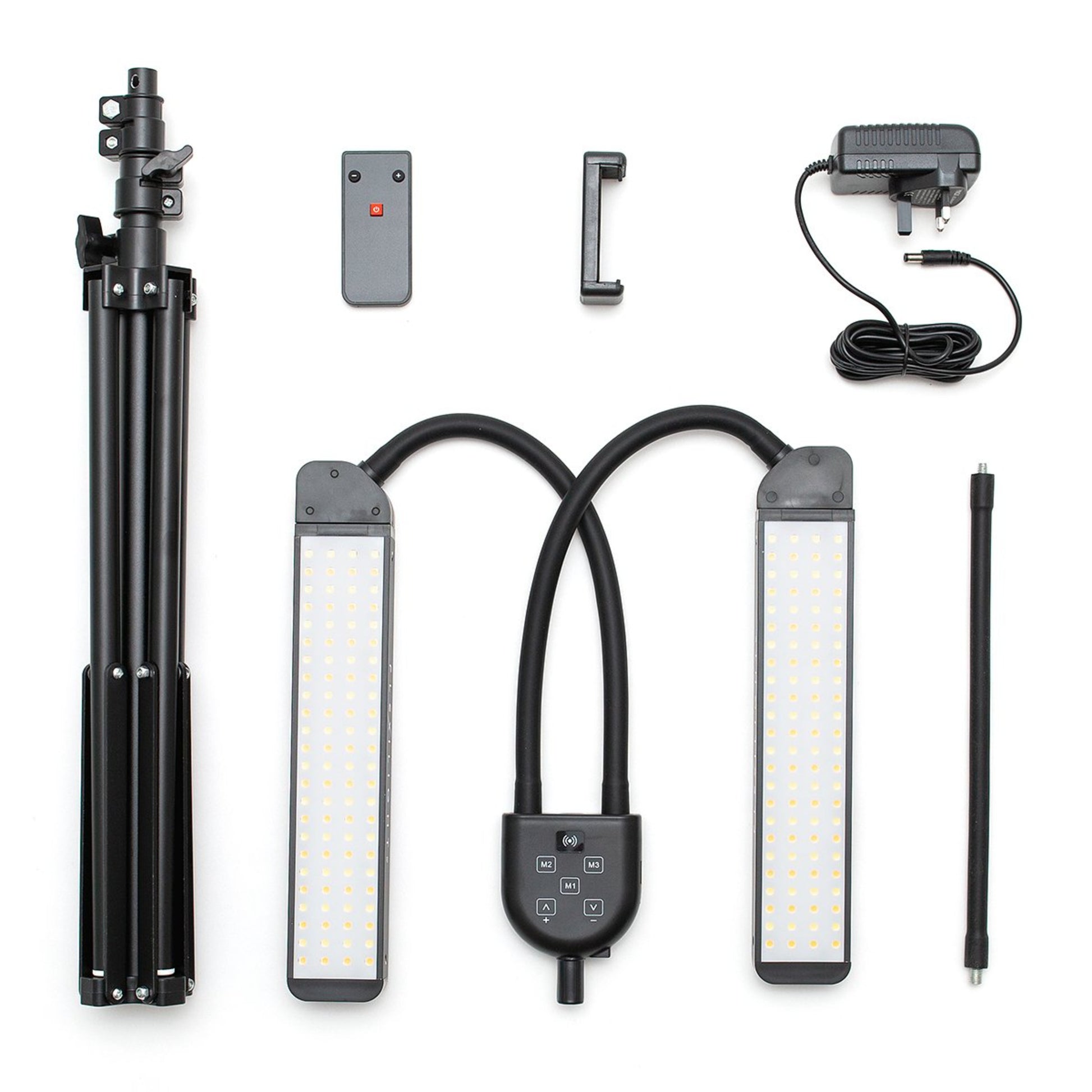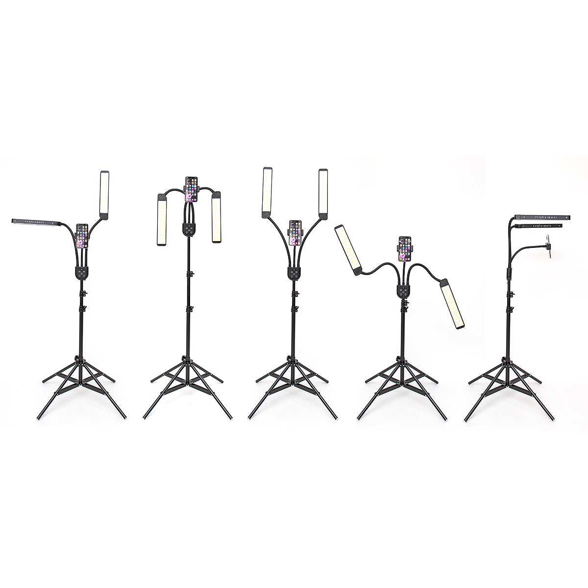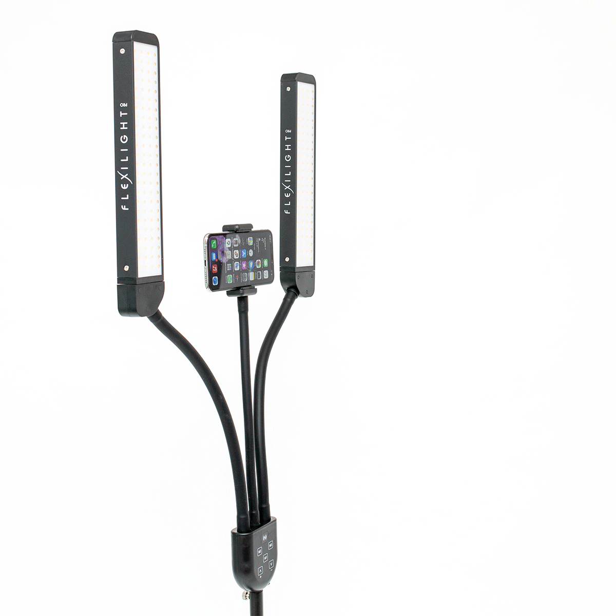 FLEXILIGHTPRO professional lightening system includes dual, flexible arms with a telescopic pole for easy transportation and adjustability. The base is extra sturdy compared to other lamps on the market.